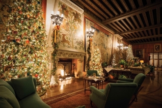 More than 100 evergreen trees bearing thousands of ornaments and miles of lights, ribbons and fresh garlands mark the extravagant celebration happening at Biltmore…