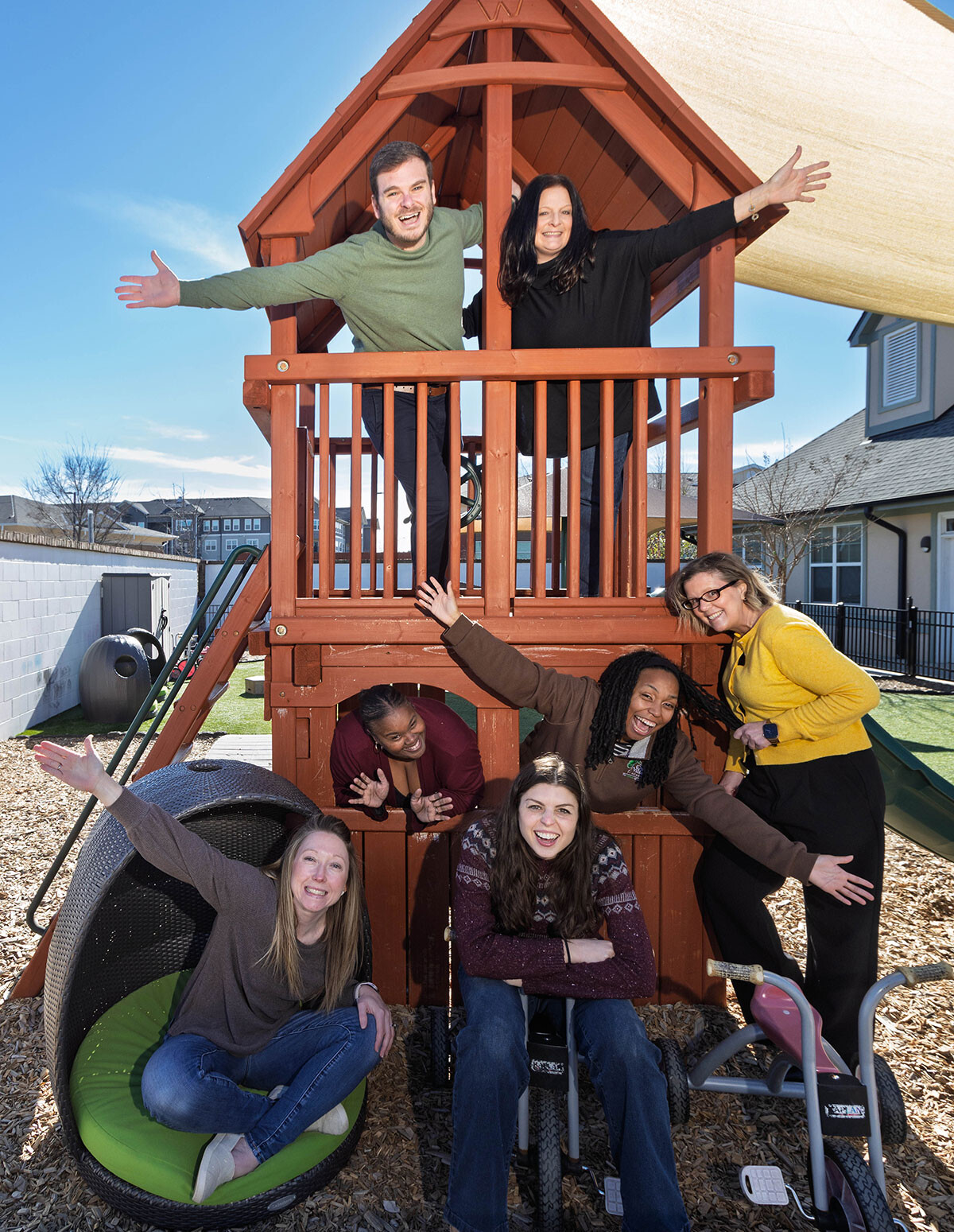 As one of the first preschools in the area to emphasize Outdoor Learning Environments as the basis of campus design, Oak Village Academy owner Alicia Fink designed the school’s campus with detailed intention, implementing a variety of architectural styles on the building exteriors in the interactive outdoor learning village.