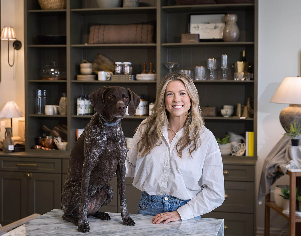 Designer, shop owner, and the face behind Blake Interiors, Kelsey Carlton often has her dog Frankie by her side.