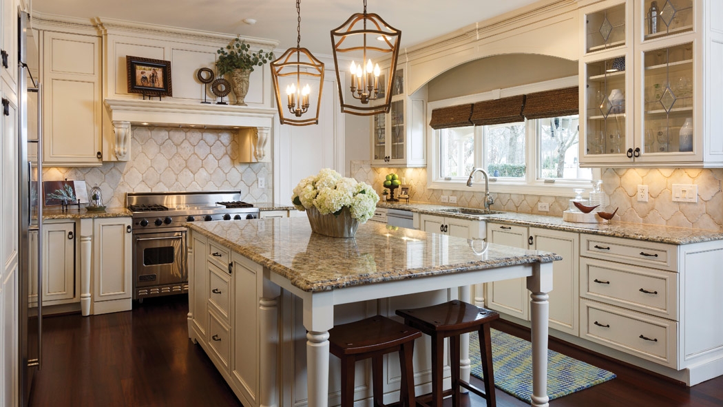 Look closely for some of the best details in this kitchen refresh: The cabinets, formerly a buttery yellow, were refinished and glazed, and hardware updated from silver to oil-rubbed bronze. The backsplash, updated with handmade tile from California, “spoke to me,” says homeowner Gretchen Cooling. Designer Vicky Serany notes that the tile is neutral, but has great texture and adds visual interest.