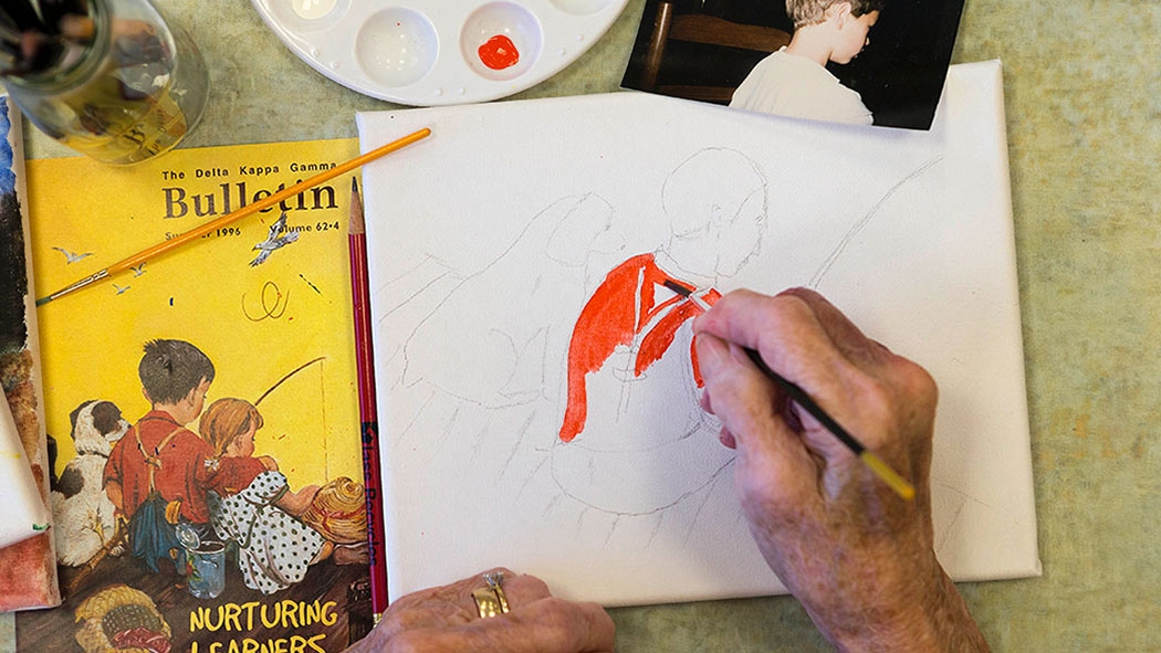 Jeanette Brooks bends her head toward the canvas, applying careful brush strokes to a portrait of her grandson and his dog. At the opposite end of the table, Joy Scott is painting a landscape, from a photograph.