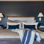 Homeowners often overlook the dramatic possibility of wallpaper, focusing instead on paint color and fabrics. Beautifully painted walls can change the look of a space, but wallpaper tells a story and makes you want to linger longer. In this home, subtle cream wallpaper with imprinted brushed gold stars elevates the primary bedroom. Although the wall is mostly windows, the paper accents them and brings attention to the space.