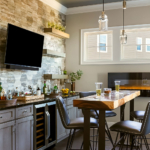 Amanda’s favorite space is the barroom. Originally an unused office space — and with the clients needing room for friends and family to gather — the home bar includes a wall of earth-toned cabinets, hexagon-shaped faux wood tiles, large-veined quartzite, a deep bar sink, and a custom bar with a chamcha wood live-edge top and custom metal legs fabricated by a local metal artist.