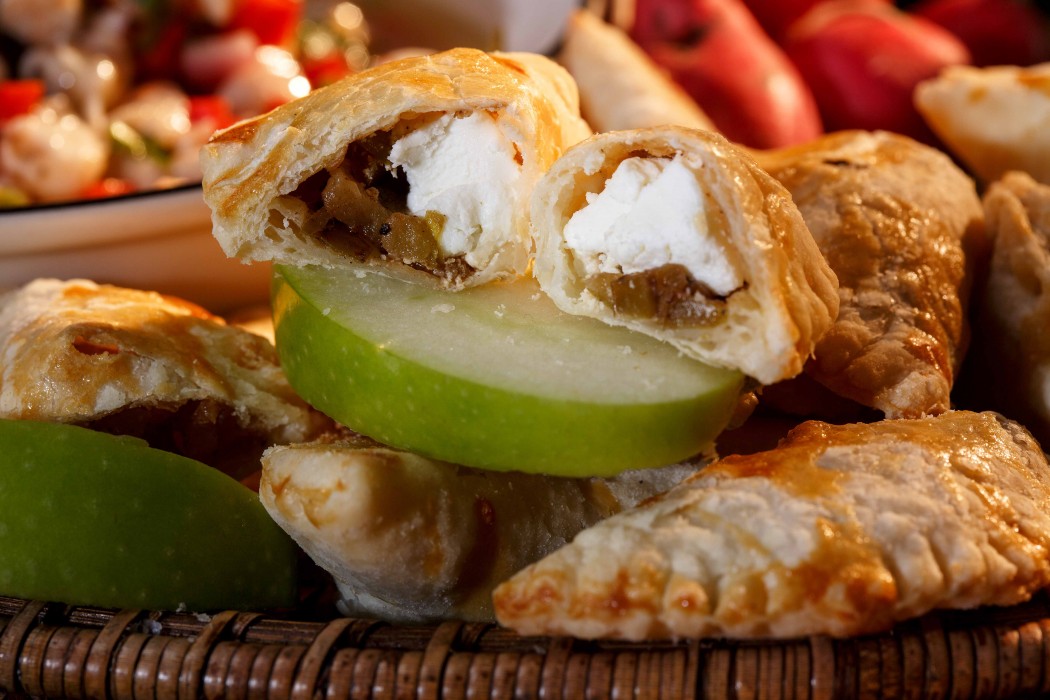 Brush the edges of the cutout pastry sheets with egg mixture, place some apple mixture and the goat cheese mixture in the middle, fold pastry over mixture and crimp the edges.