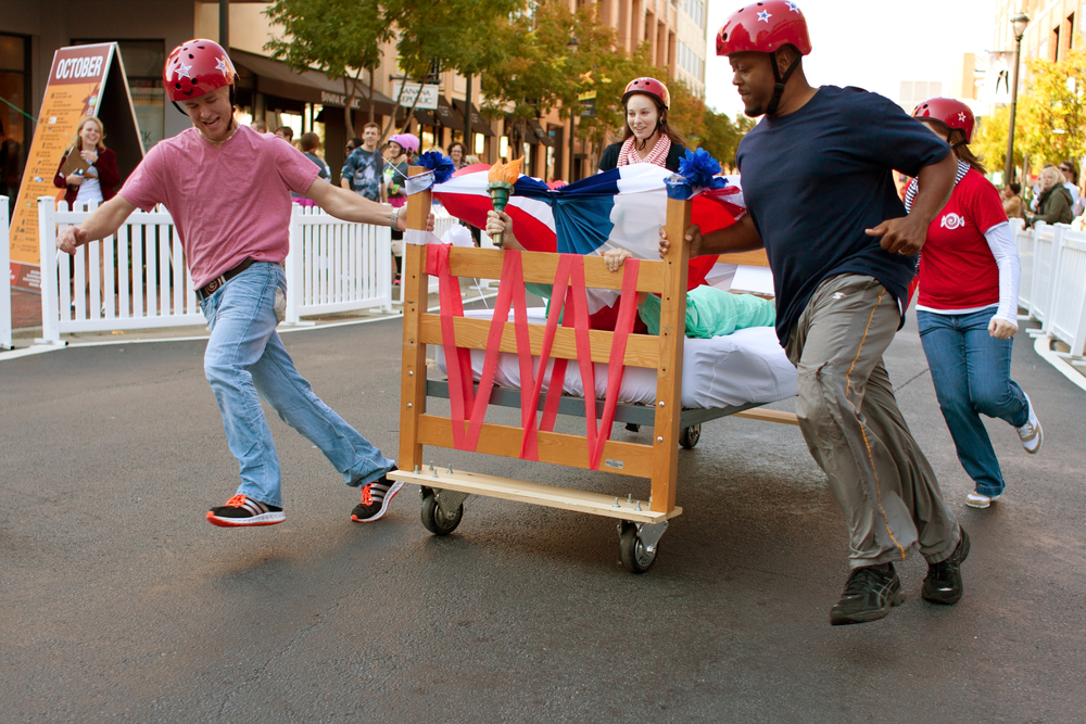 Each team will design, build and race its own beds; one team member will ride on the bed and four others will push.