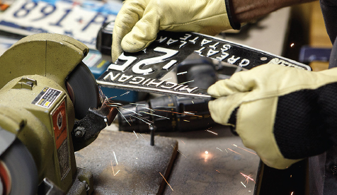 Sparks fly when Peter Geiger’s at work … literally, as he grinds old license plates into one-of-a-kind art.