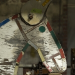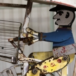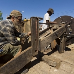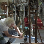 Volunteer Tom Lendra of Raleigh, a retired banker, happily makes the one-hour trek to Wilson to be part of the conservation project. The intricate parts of this piece include turning wagon wheels, a waving driver, and twitching ears and galloping legs on the horses. “It’s amazing, what Vollis came up with — his mechanical skills, his understanding of physics,” Lendra says. “His creativity is unbelievable.”