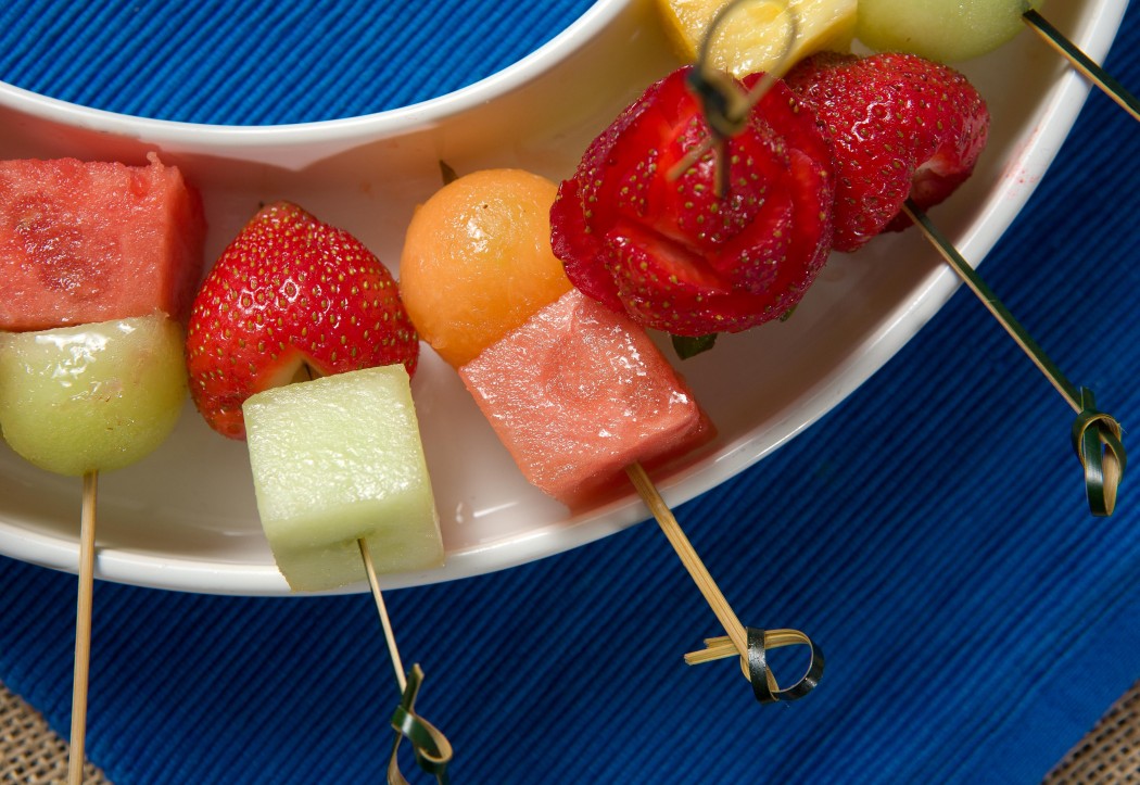 Arrange fruit skewers on a platter and serve the guava cream on the side.