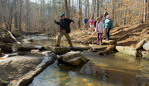 Vicki Sell adn others take part in an organized group hike at Umstead Park, led by outdoor writer and guide Joe Miller.