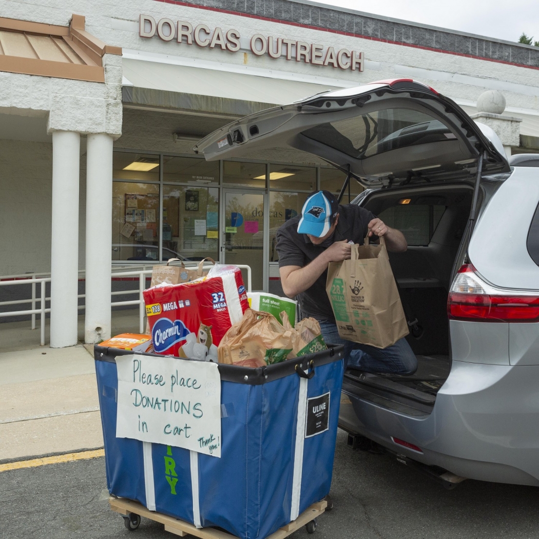 Aaron Elzie, an employee of Dorcas Ministries Food Pantry, assists a woman at its curbside emergency bag pickup. People in need can sign up for food assistance at clientservices@dorcascary.org or call (919) 469-9861, ext 203.