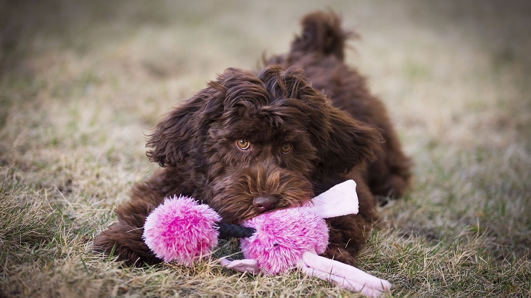 Brie the Labradoodle eyes a stuffed bird during playtime with Rocio Lopez, center, and her children, Valentina Trovero, 11, left, and Lorenzo Trovero, 13.