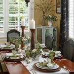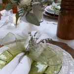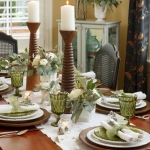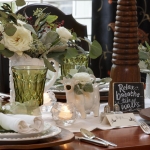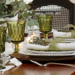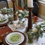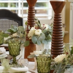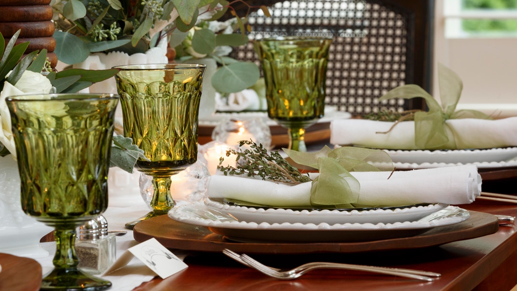 “For informal settings, use items from around the home that have special meaning,” Riley said. “My two favorites are my white milk glass collection nestled inside an old wooden box that my dad made. Or, creating a vignette of my mother’s Noritake green glassware. Glassware is beautiful when you add floating candles or use it as flower vases.