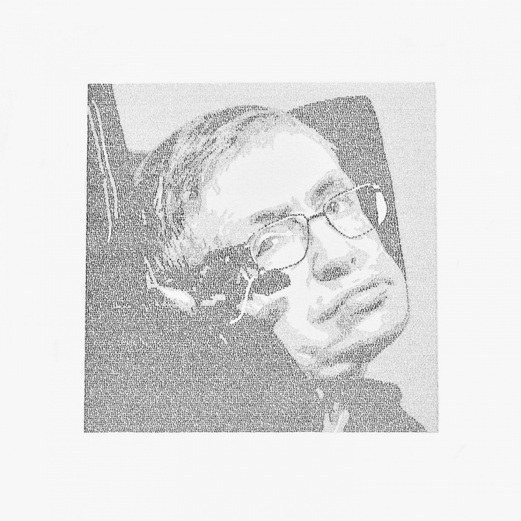 I began doing the textual pointillism drawings in 2001. The first one was a drawing that was featured in a local exhibition that asked artists to respond to the Sept. 11 terrorist attacks. The drawing was called “Beyond Words” and consisted of the word GOD in large block letters. The G was the word “Judaism” written over and over, the O was the word “Christianity,” and the D was the word “Islam” written hundreds of times. After that I had the idea of using the same kind of tiny writing to make images instead of just larger words.