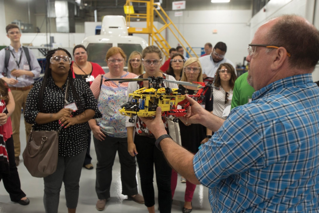 David Clark, software engineer at Lord Corporation in Cary, uses a Lego helicopter created by his colleague, system safety engineer Casey Irvin, to demonstrate concepts behind the company’s Active Vibration Control System, used in commercial and military helicopters, and even cellphone technology,  to Wake County schoolteachers who are working to bring real-world STEM education into their classrooms.
