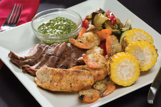 The main dish is a mixed grill, or three smaller meat options rather than one large, to take guests’ preferences into account. Today those meats are flank steak, chicken sausage and shrimp.