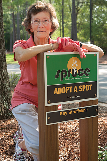 Much of Struffolino’s volunteer work has blossomed from her involvement in the Department of Parks, Recreation and Cultural Resources. She cleans up R.S. “Dad” Dunham Park in Cary, which was named for a friend of hers. She’s on the festivals committee and helps to plan Spring Daze and Lazy Daze every year. She’s been on the department’s advisory board off and on since the early ’90s and is currently serving as the liaison for a new park the town is getting ready to build. She volunteers at the Senior Center, as well as with the Cary Cross Currents Chamber Music Arts Festival. In short, if it’s something under the umbrella of the Department of Parks, Recreation and Cultural Resources in Cary, you can count on Kay Struffolino having been a part of it.