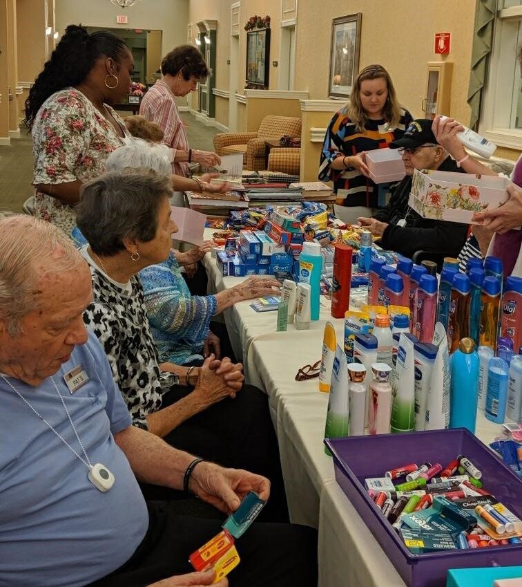 Residents of the senior living community wrote heartfelt letters of gratitude and tucked them into boxes with donated personal care items such as sunscreen, deodorant, body wash, toothpaste and lip balm. They also included snacks like granola bars, dried fruit and nuts because they are lightweight and easy to carry.