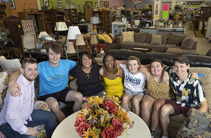 Hope Connection International founder and president Debra Barkett, third from left, sits with employees and volunteers at the nonprofit’s thrift store, Deja Vu, which helps support survivors of abuse and addiction. From left are Benjamin Weston, Kirk Williams, Barkett, Deja Butler, Will Walters, Taylor Farnham and Aaron Garner.