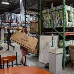 Josh Pressley, who works in the nonprofit’s warehouse, prepares furniture that has been ordered online for delivery.
