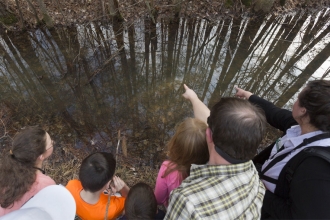 On a warm afternoon in late winter, Joanne St. Clair leads several families in a game of nature bingo along the American Tobacco Trail…