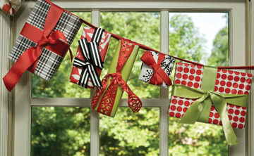 Chapman agrees. In a nod to her own lifestyle, as mom to two little boys, Chapman thinks “up” in holiday decorating: window décor that blends her love of texture and fabrics. Her winter valances feature gift boxes threaded onto ribbon, and felt mittens hung on a twine line.