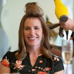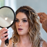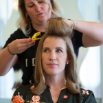 Emily Teeter’s curly hair is tamed into a sleek, bouncy style by stylist Rachael Woolsey.