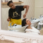 Mari McKenzie relaxes as she has her hair washed before getting her hair styled.