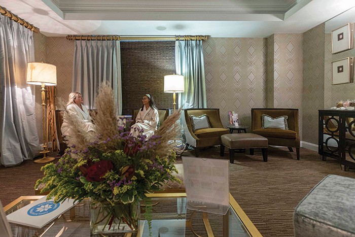 Kristen Daniels, of Raleigh, and Leslie Rivera, of Cary, relax in the upstairs lounge at La Therapie Spa. Many clients book several services and spend an entire day getting pampered.