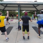Goofy costumes and props add to the fun during a total body high intensity interval training class at Thomas Brooks Park in Cary.