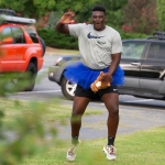 Dave Phillips of Raleigh lifts a dumbbell during an outdoor class with Six Foot Fit.