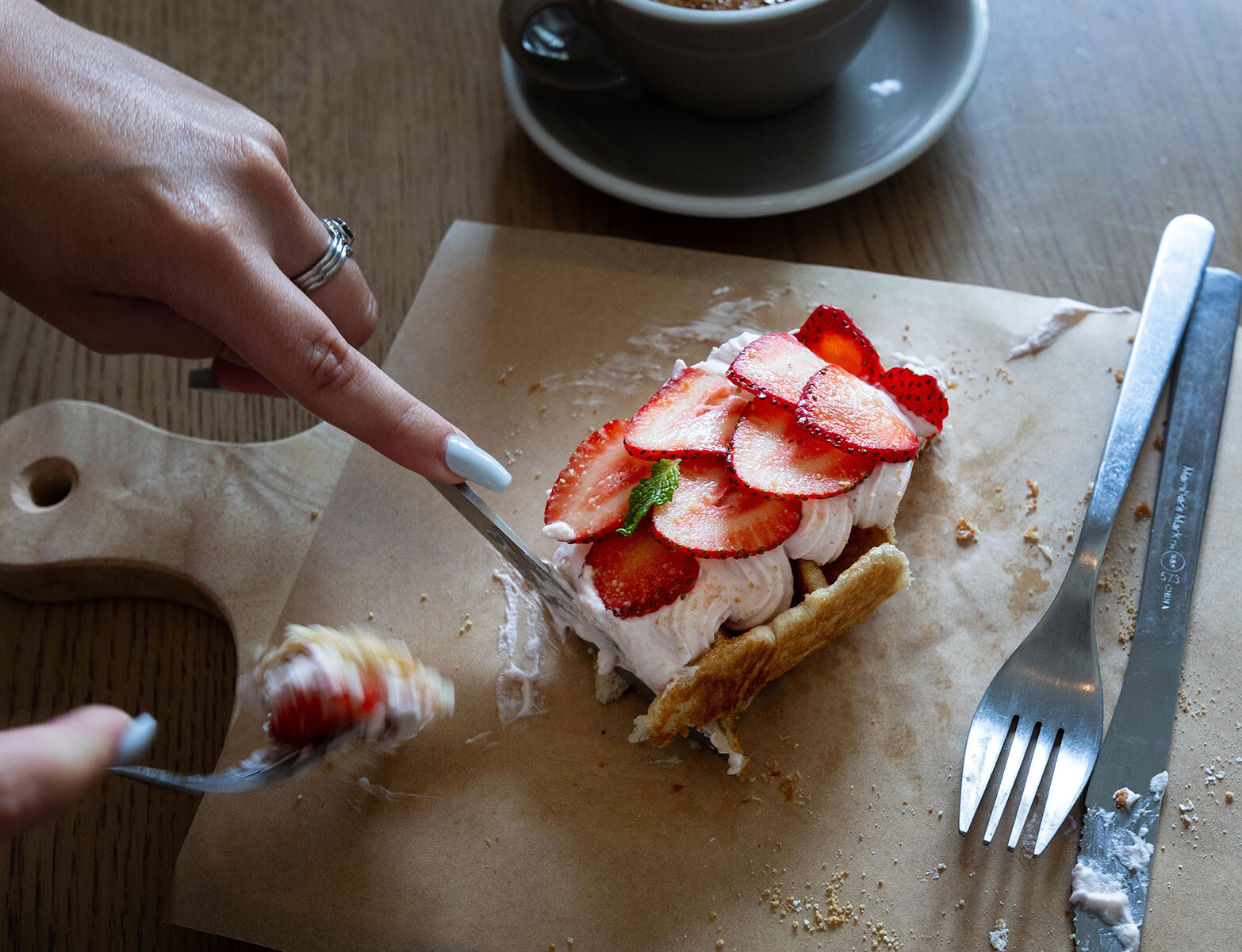 As for food, Sweet Talk’s Strawberry Creme Croffle is the most popular menu item — and one of Jasmine’s personal favorites. This croissant and waffle hybrid features buttery inner layers and the crispy crust of a traditional waffle. The piped-on strawberry cream is subtly sweet and topped with fresh-cut strawberries, graham cracker crumbs, and powdered sugar. And take it from us: This is one you cannot miss!