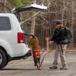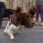 Search-and-rescue springer spaniel Jet prepares for a morning of training with her owner Audrey Low. “That dog has one speed: wide open,” says volunteer Kevin Bean.