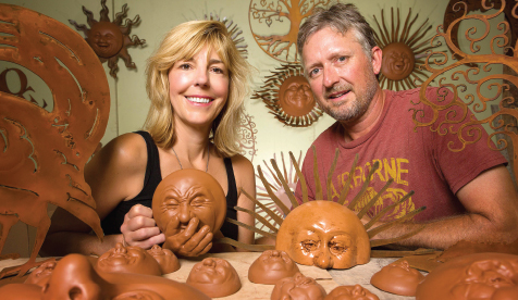 Their company, Elizabeth Keith Designs, creates whimsical wall art and décor that can be displayed indoors or out. The most popular offerings are 3-D cement faces, exhibiting expressions like blissful, grin, peaceful, squint and smokey.