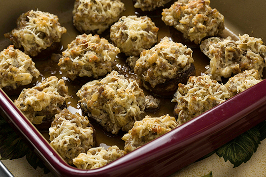 Remove from heat and add cream cheese, salt, pepper and garlic. Stir together till mixture is creamy and ingredients are blended. Spoon mixture into mushroom caps evenly. Sprinkle tops with Parmesan cheese.