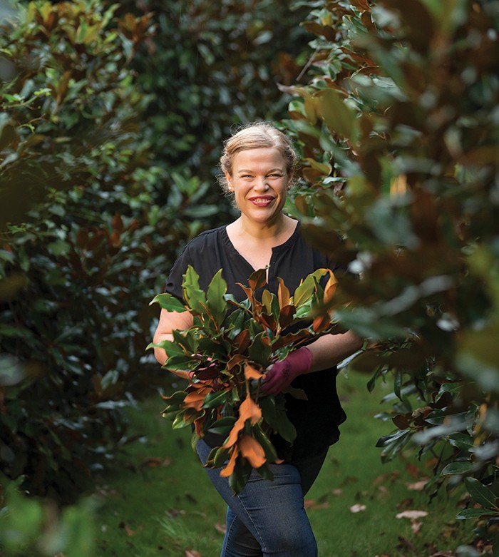 To bridge the financial gap, Weston’s father suggested she cut branches from her grandmother’s prized magnolia tree and sell the arrangements. The seasonal greenery proved popular, with the magnolia garlands and bouquets selling out regularly. She was initially reluctant to create and sell wreaths, but as she says now, if you are a small business owner, you have to listen to your customers.