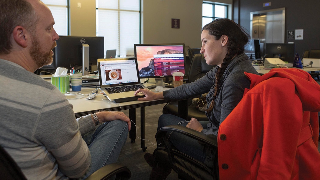 The environment is casual, but the work is anything but at Cary Cofounders Lab, a public-private partnership managed by investor and serial entrepreneur David Gardner. The lab, one of several business incubator programs in Western Wake, offers guidance to startups like Myxx, a new app that connects retailers, brands and consumers through recipes, launched by Monica Wood and Stuart Allen, pictured. At far right is Juan Porras, founder of Factivate.