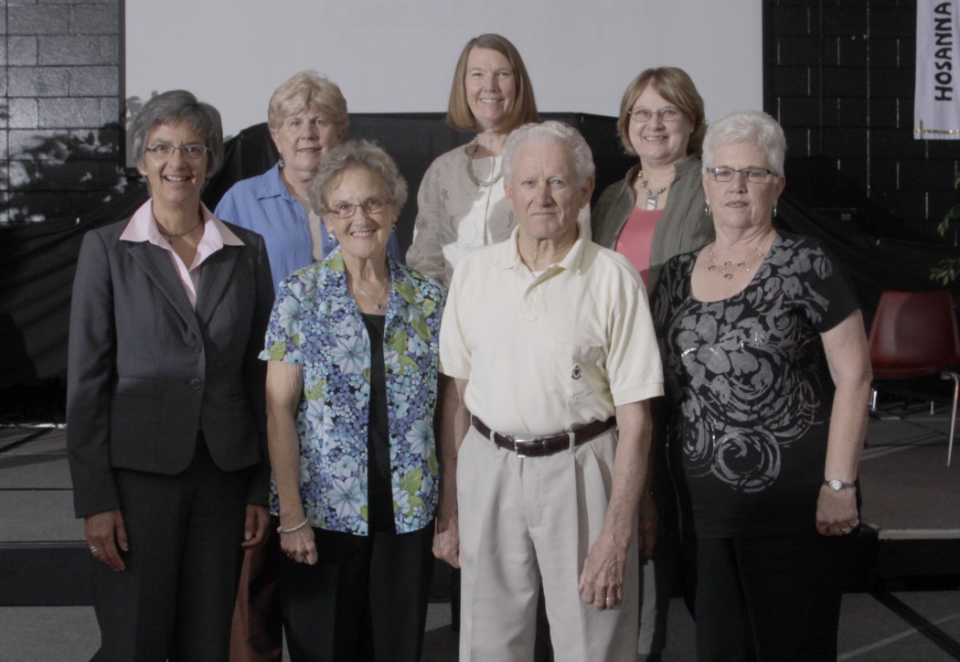 White Plains Founders. Front row, left to right: Bishop Hope Morgan Ward, Sandy Sheppard, Fred Pippin, Faye Ballington. Back row, left to right: Bette Anne Stephenson, Babs Gallion, Vicki DeMaster. Not pictured: Rosemary Gaddy. Photo courtesy Thomas Babb, Babb Photography.