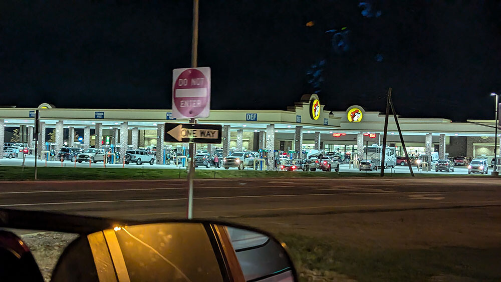 We resign ourselves to being substantially behind schedule on day two and select a campsite, but we need a few supplies before we park for the night. We stop at Buc-ee’s, which could easily be the subject of its own article, and pick up an amusingly diverse cart full of items ranging from trash bags and bottled water to Beaver Nuggets and hot chopped brisket sandwiches.