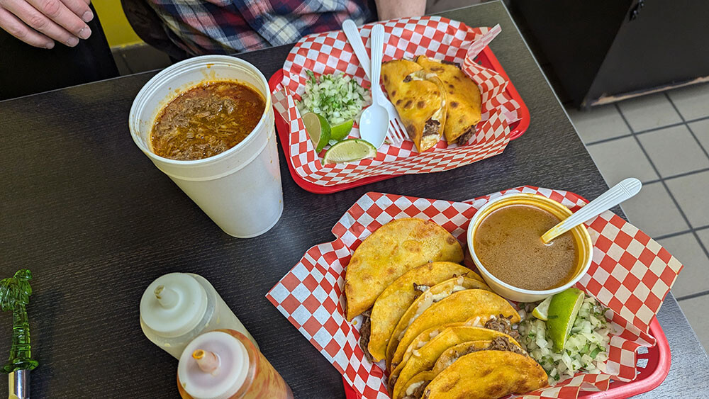 The doors are locked. Odd. So we walk to a hole-in-the-wall restaurant in the adjoining shopping center and have the best meal of the trip: birria tacos and ramen.