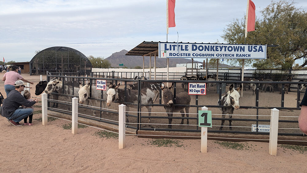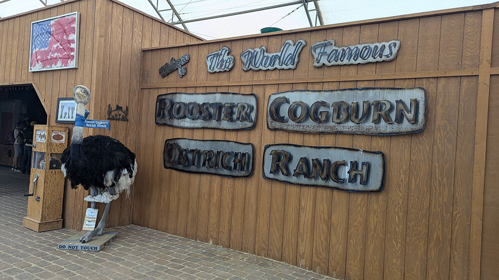 One does not simply drive past a place called Rooster Cogburn Ostrich Ranch, so we take an unexpected stop to feed all manner of critters: donkeys, goats, tortoises, stingrays, lorikeets, bunnies, and of course ostriches.
