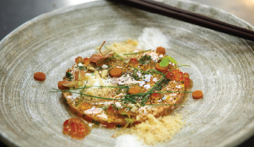 Among the chef’s most imaginative creations is the Salmon Tartare, which he revealed as his favorite dish. Precisely prepared using a blowtorch for charring, the tartare contains Kobocha squash, shiso, coconut, burdock root, Japanese sudachi fruit and barrel-aged maple syrup.