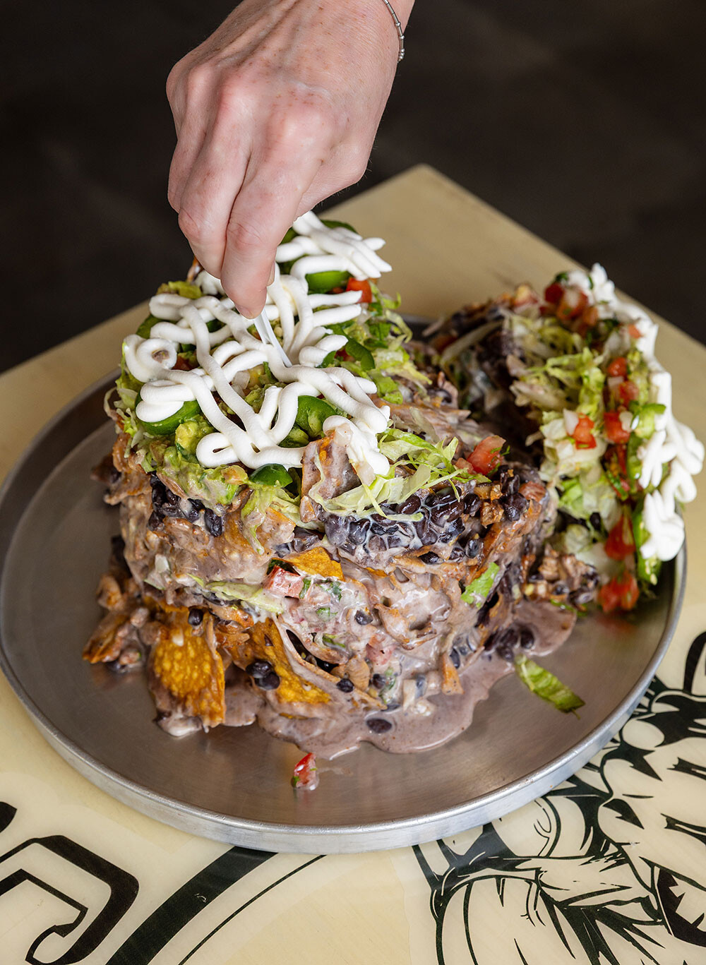 Also known as “trash can nachos,” Tower Nachos make for an Insta-worthy reveal. Served from a tin can that is placed on the table, a tower of chips piled high with queso, beans, pico de gallo, lettuce, guacamole, sour cream, and peppers cascades out when the can is lifted. Chicken, carnitas, chorizo, pastor, or carne asada can be added, and tequila makes for a natural accompaniment.