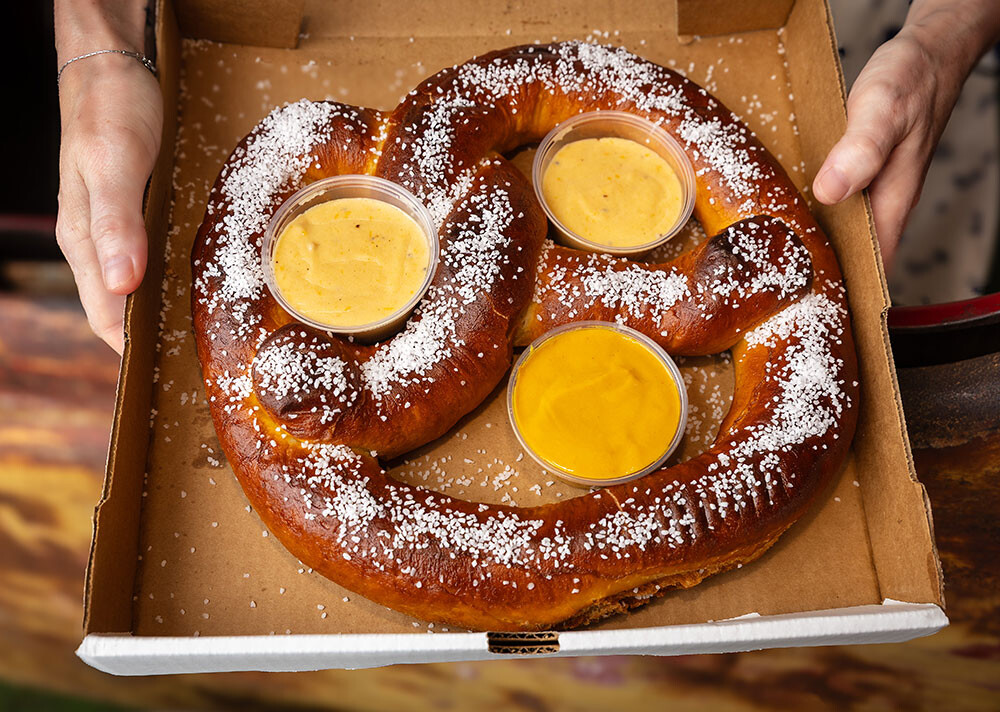 First-time customers are often surprised by the size and weight of the pretzel, which is presented in a pizza box. It features a hard exterior crunch and doughy interior, which makes for ideal dipping in the house-made beer cheese. This crowd-pleaser is “worth telling your friends about,” says Jon, and can also be ordered for home delivery enjoyment!