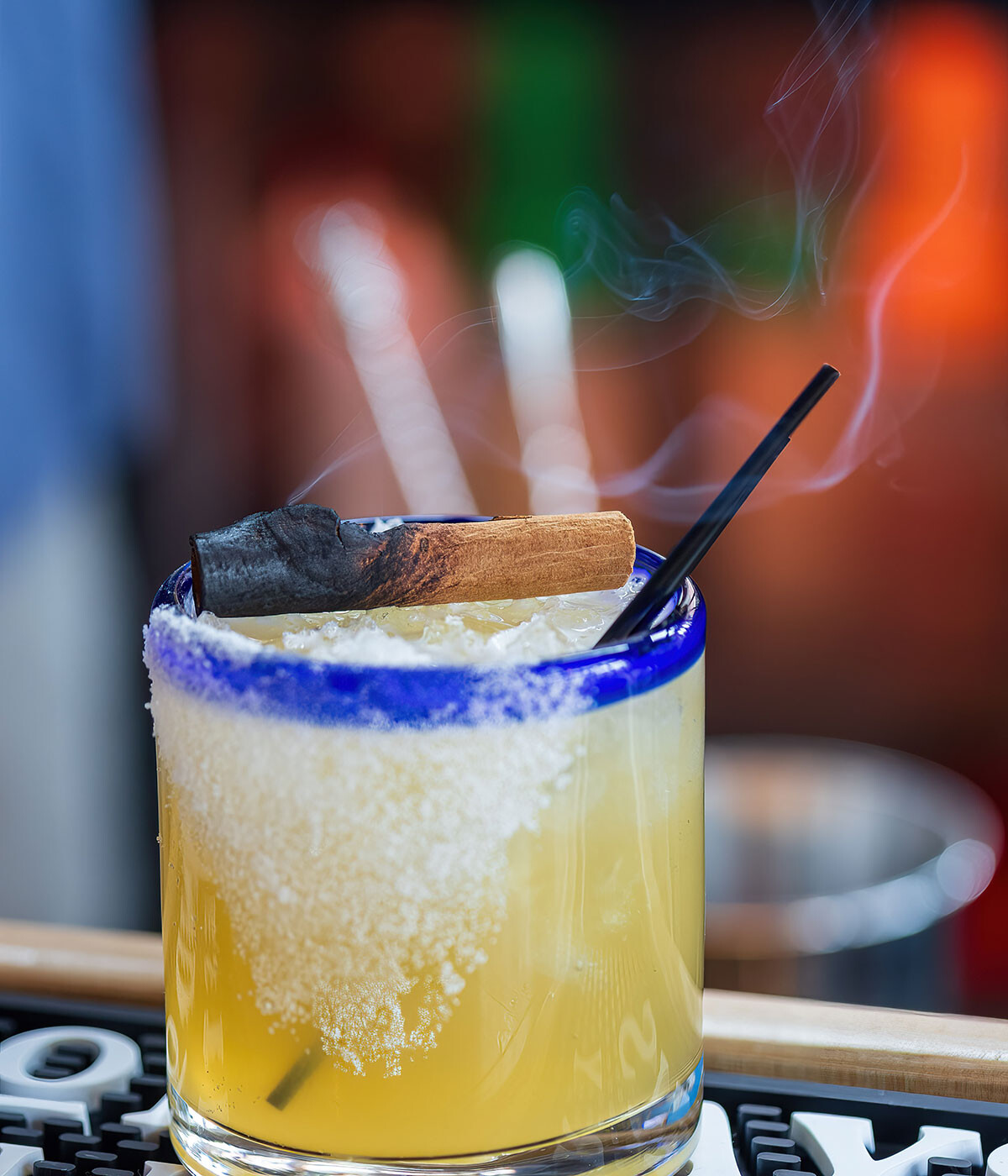 The chilled Cinnamon Apple Cider Margarita on the bar’s winter menu boasts tequila, apple cider, triple sec, and cinnamon simple syrup — and can be made smoky.