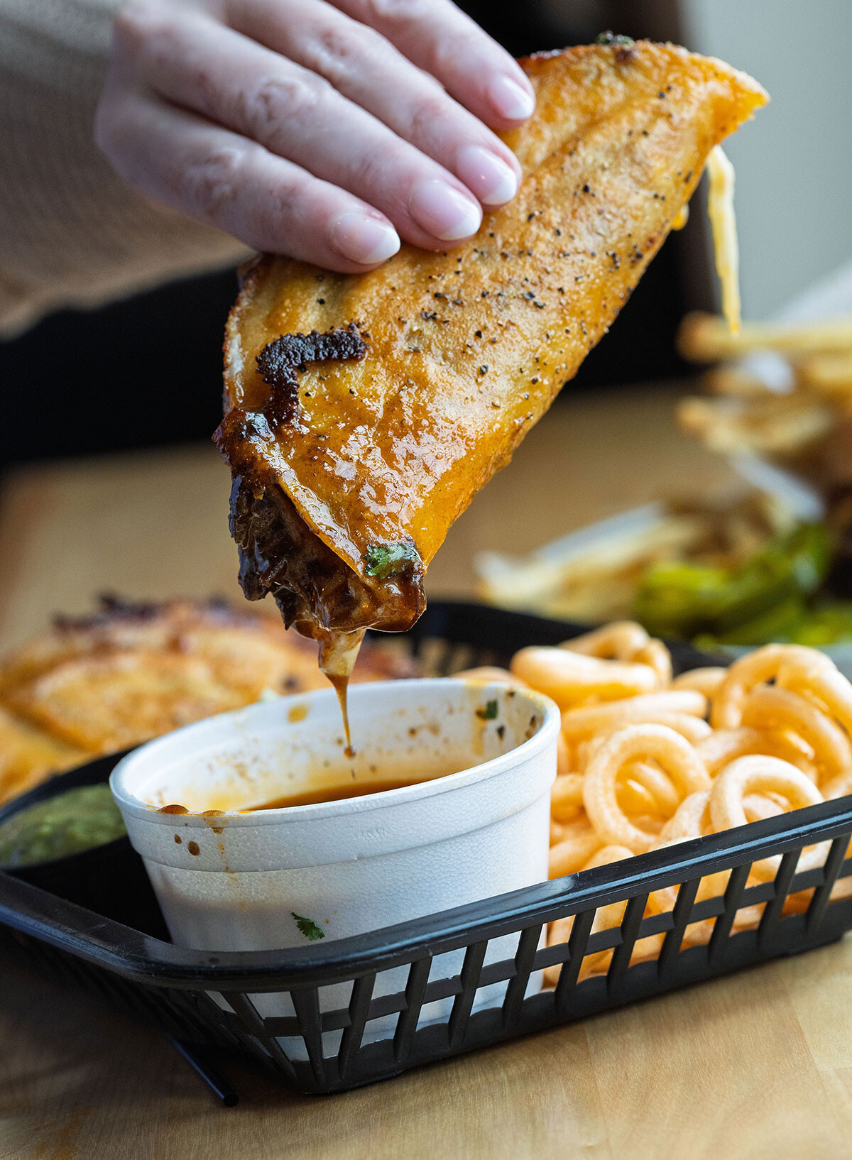 The handheld Smoked Brisket Quesabirria features smoked adobo brisket, Oaxaca cheese, cilantro, onion, citrus, and plenty of consommé for dipping.