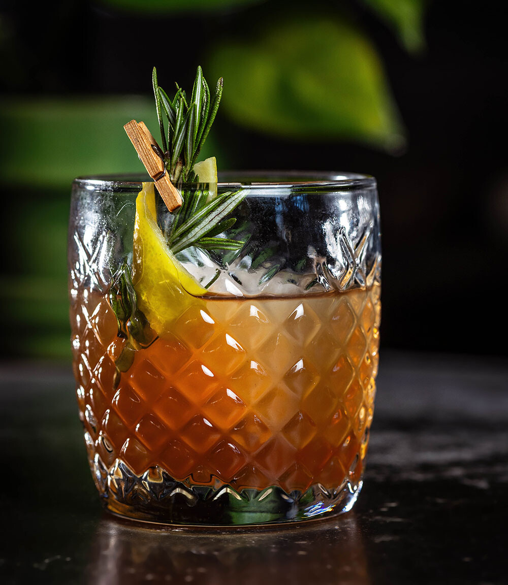 Measure all ingredients into a rocks glass over a large ice cube. Stir. Express a strip of lemon zest over the top and garnish with a sprig of rosemary.