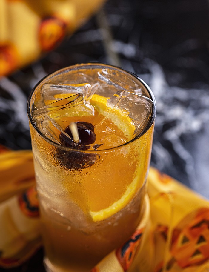 Strain into a collins glass filled with ice, the orange slice and cherries. Top with ginger beer.