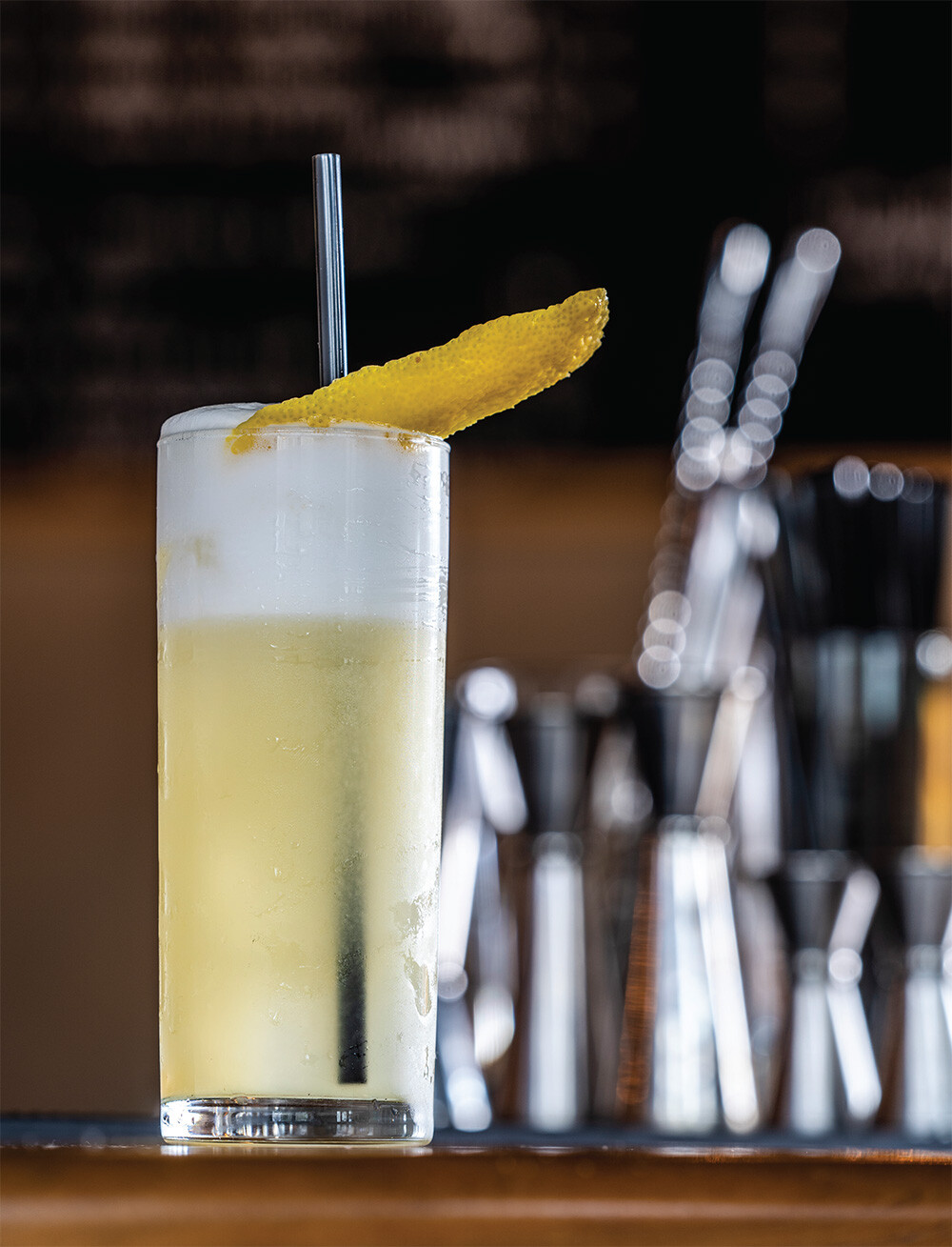 Combine all ingredients through egg white in a shaker. Dry shake vigorously for approximately 45 seconds, then add ice and shake again until chilled (roughly 15 seconds). Double strain into a Collins glass filled with ice. Top with club soda. To create a nice foamy cap on the drink, let it rest for about a minute, then top again with another heavy splash of club soda to allow the froth to rise up out of the glass slightly. Express a lemon peel by twisting it with your thumb and forefingers of both hands over the top of the glass. Run the peel around the rim of the glass and set it on the rim.
