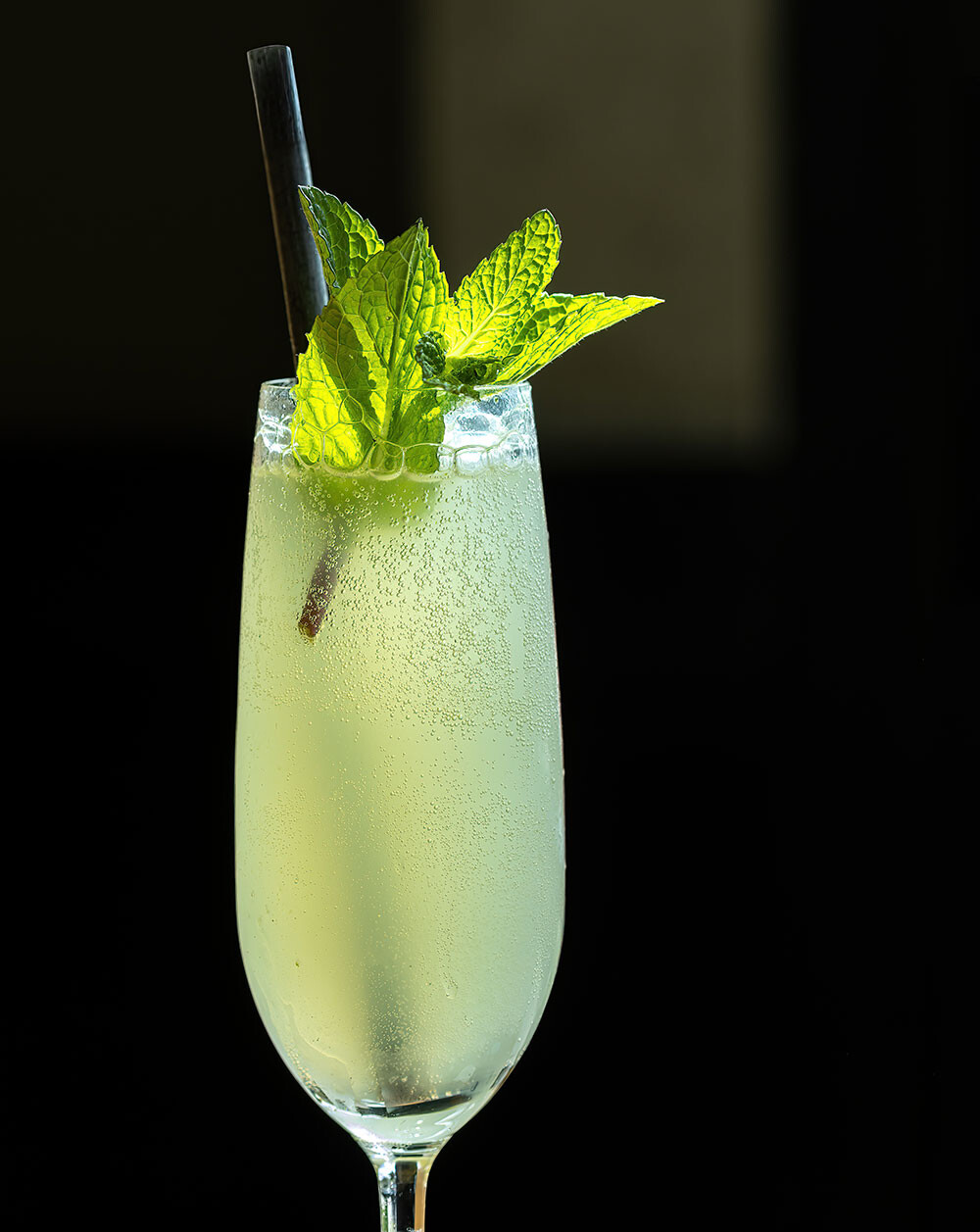 Combine all ingredients except soda water in a shaker with ice. Shake and strain into a flute. Top with soda water. Garnish with a mint sprig.