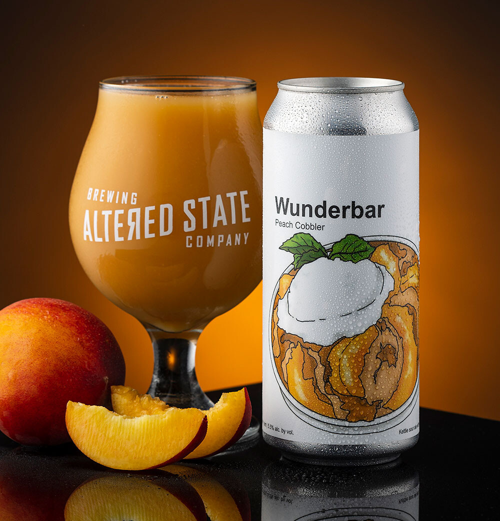 The Wunderbar series begins with our kettle sour base, amped up with fruit purees and other flavors inspired by our favorite desserts. Wunderbar Peach Cobbler is our take on the Southern summer classic. With additions of peach puree, brown sugar, cinnamon, and a hint of milk sugar, it is meant to take you back to the peach cobbler your grandmother used to make.